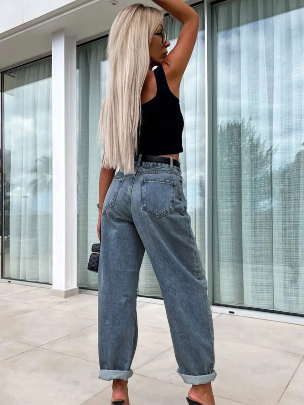 £36.99 Select options This product has multiple variants. The options may be chosen on the product page💙 Azure Rise Denim – High-waisted barrel mom fit with subtle stitch detail, soft stretch fabric, and functional pockets. Sizes UK 6–14. Inside leg approx. 28″ (72cm).