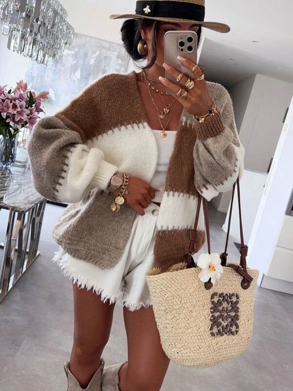 £39.99Original price was: £39.99.£29.99Current price is: £29.99. Add to cart🤍 Stone Contrast Knit Cardigan – Soft, stretchy knit with neutral colour block design. Open front. One size fits UK 8–14. Length approx. 26″ (66cm).