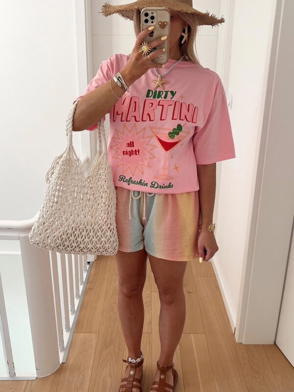 This dusty pink graphic top brings the fun with its bold “Dirty Martini” print, playful cocktail icons, and comfy stretch cotton fit. One size fits UK 8–14. Made in Italy with love. 💕