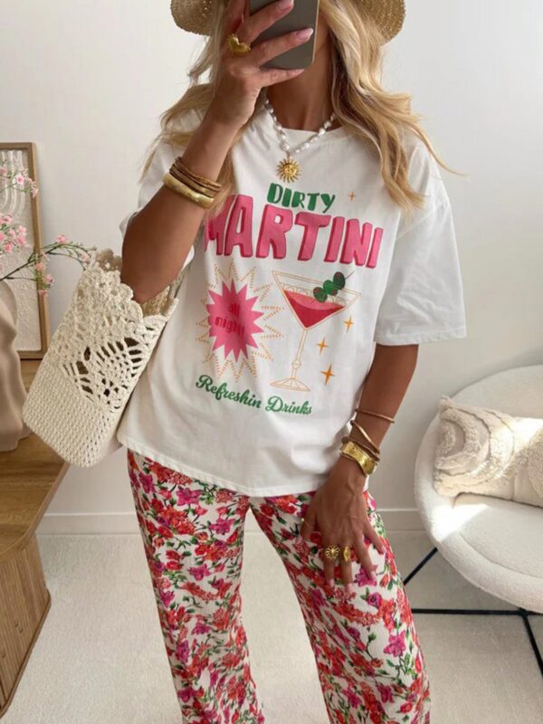 The Chilled & Classic tee in soft ivory features a playful cocktail-inspired graphic on ultra-comfy cotton. One size fits UK 8–14. Made in Italy with love. 💫