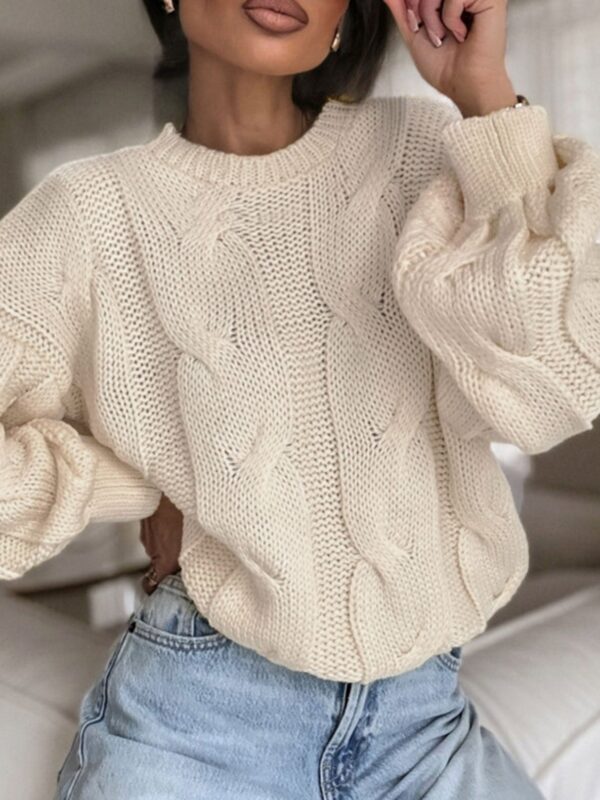 🤍 Pebble Glow Sweater – Light cable-knit with a soft, stretchy fit. Crew neck, ribbed cuffs, and perfect length for jeans or leggings. One size fits UK 8–14.