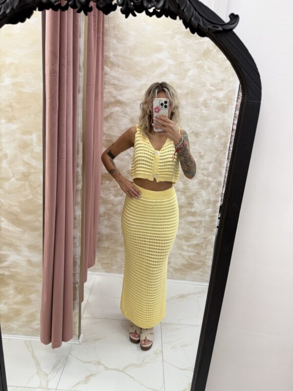 A dreamy crochet-style knit co-ord in soft pastel yellow 🌼. The Soleil Set features a cropped button-front vest and matching maxi skirt for effortless summer chic. One Size fits most.