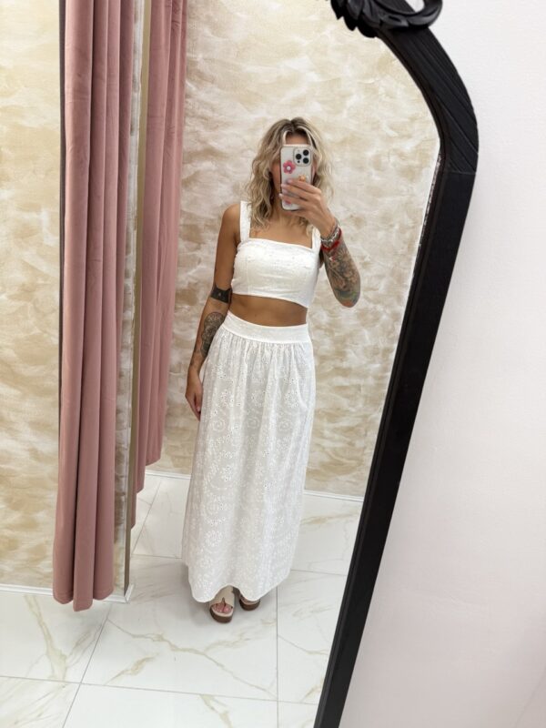 A romantic white broderie anglaise co-ord 🤍 featuring a cropped square-neck top and flowing maxi skirt. The Isla Set is the ultimate summer statement. One Size fits most.