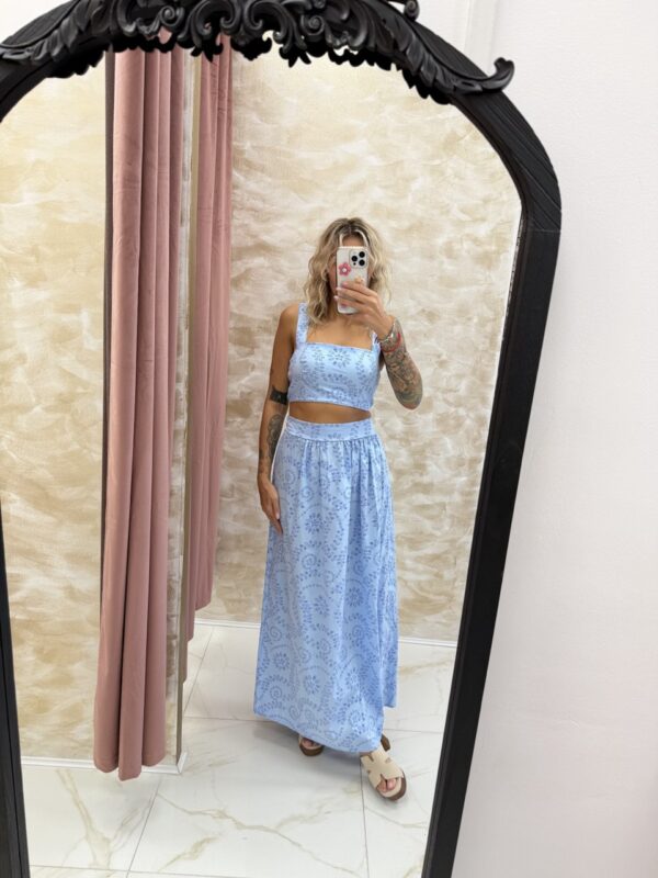 A dreamy pastel blue broderie anglaise co-ord 💙 featuring a cropped square-neck top and flowing maxi skirt. The Celeste Set is summer elegance made easy. One Size fits most.