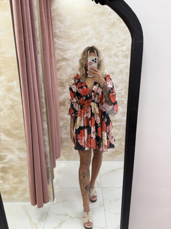 A striking floral mini dress 🌹 with a deep V-neckline, ruffle trim, and flared sleeves. The Midnight Rose Dress pairs romantic florals with a chic black base for an unforgettable look. One Size fits most.