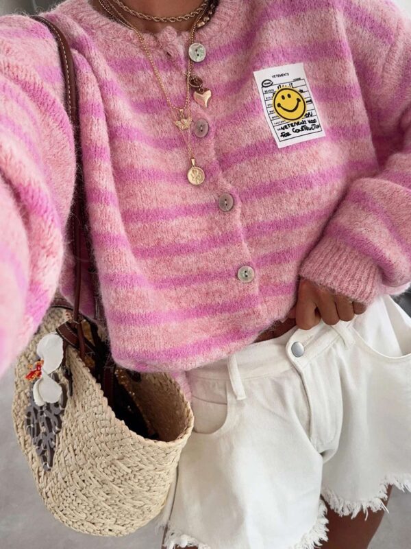 〰️ Petal-pink & cream stripes • 🔘 Button front • 🧶 Ribbed cuffs & hem • 😊 Smiley patch.