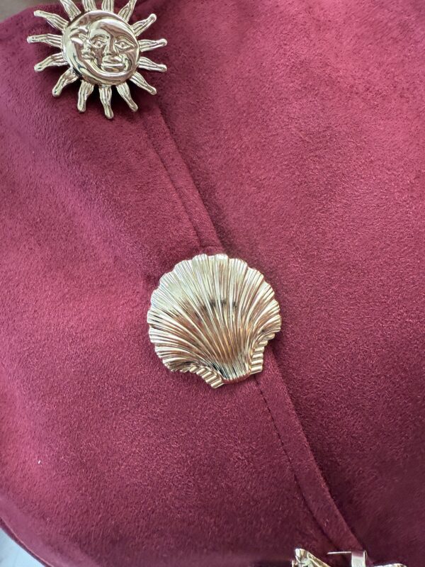 The golden statement buttons — a radiant sun, shell, starfish, and coral 🌞🐚⭐🌿 — add a touch of coastal fantasy, perfectly balancing the boldness of the fuchsia shade with elegant, seaside sophistication.