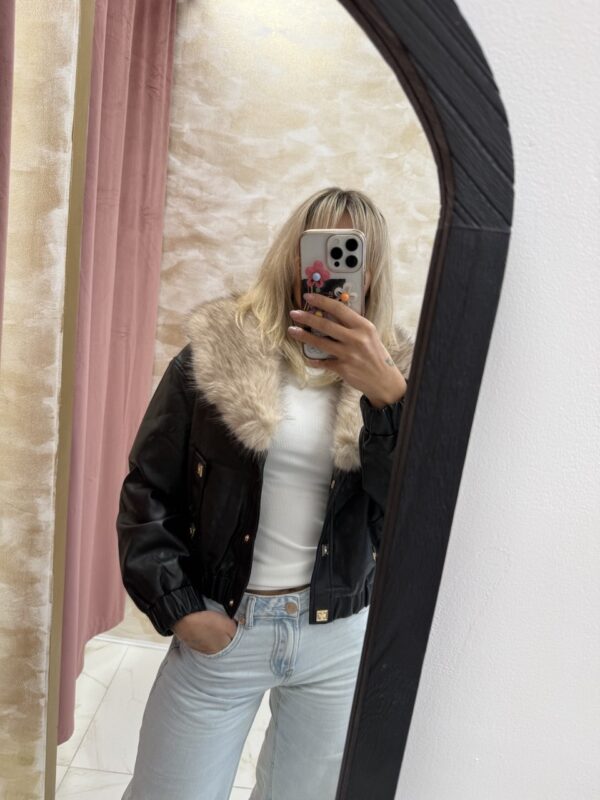Step into the spotlight with the Astraya Faux Fur Collar Jacket 🌌. Crafted from glossy black faux leather and elevated with a plush faux fur collar, this jacket blends edgy confidence with timeless glamour. Its cropped fit and elastic cuffs create a flattering shape 💃, while the soft fur trim adds a touch of cozy sophistication.