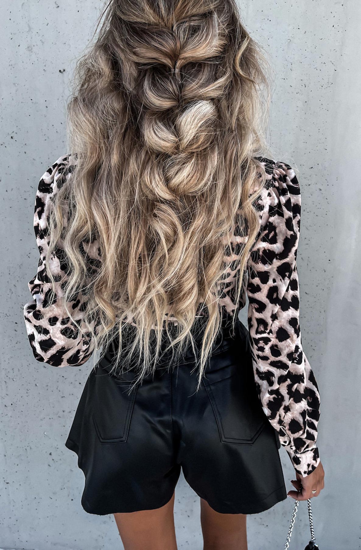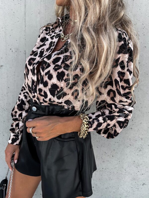 Chic brown leopard print blouse with collared neckline and button front. Long sleeves with button cuffs. Soft stretchy polyester fabric. Made in Italy.