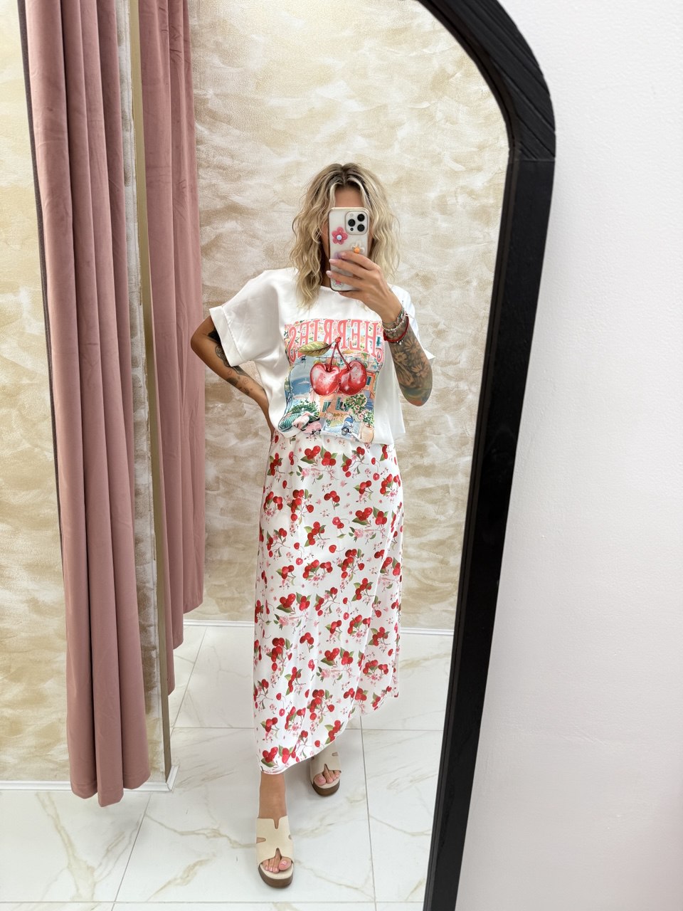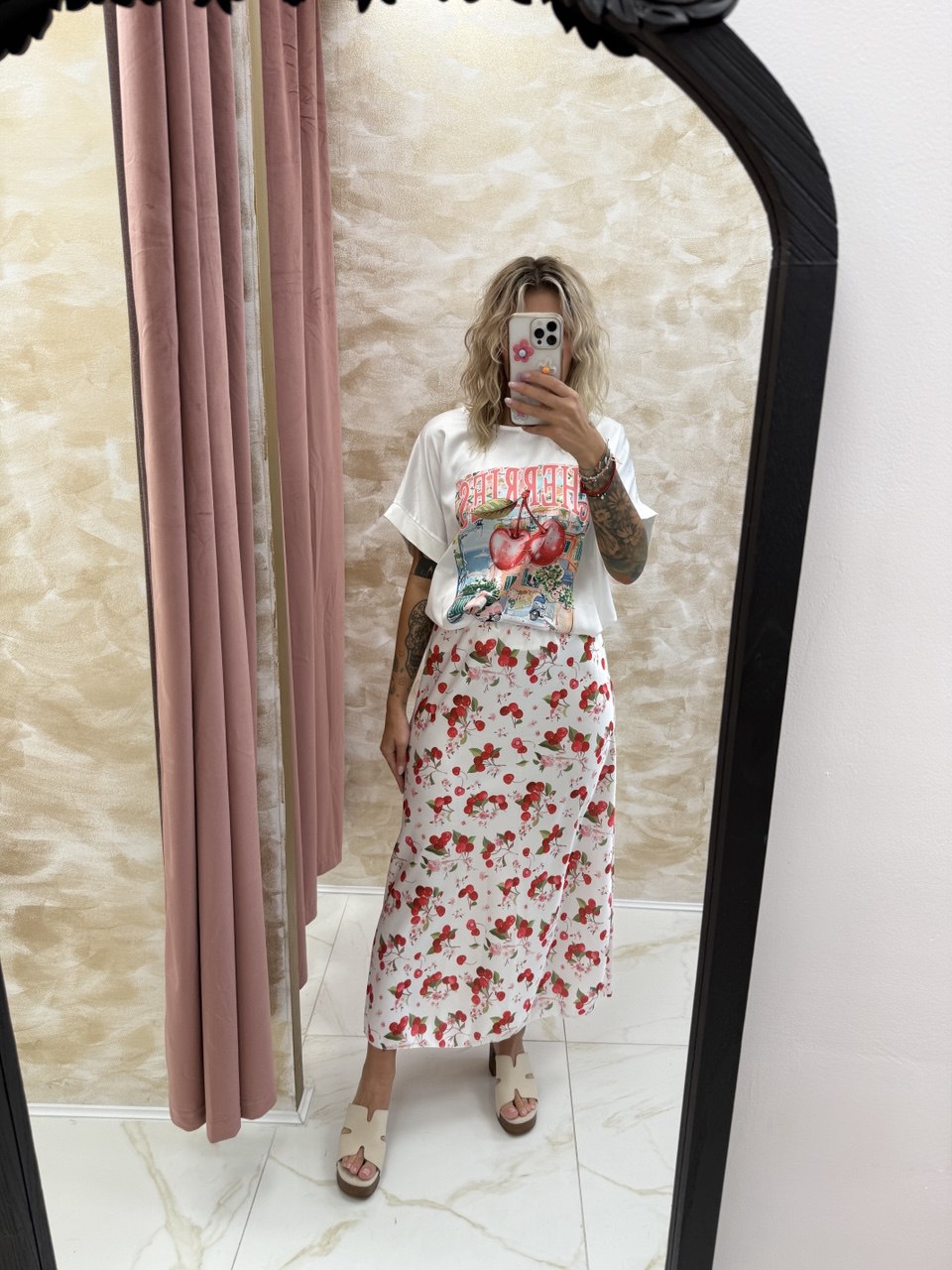 ✔️ Oversized graphic tee + cherry print skirt 🍒