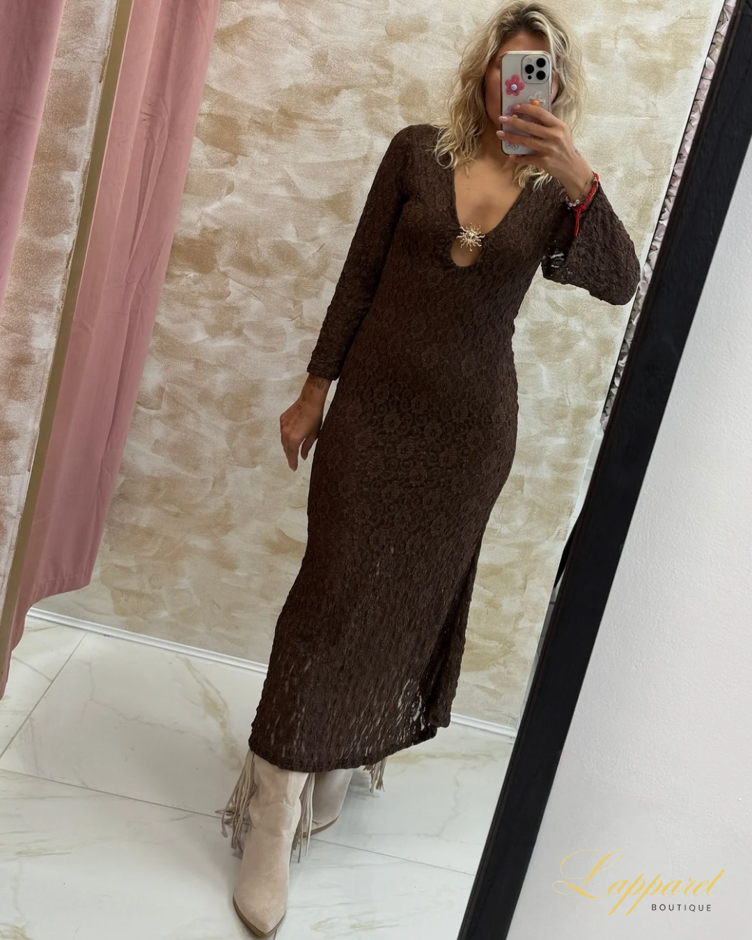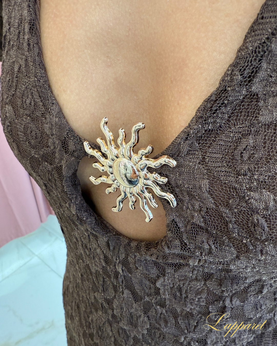 Where boho spirit meets desert goddess vibes β the Desert Bloom Sundress is a striking blend of softness and edge. Crafted in a delicate lace-textured fabric with a deep neckline and eye-catching gold sunburst brooch, this earthy brown maxi brings drama in the most effortless way. Long sleeves and a body-skimming silhouette make it perfect for transitional seasons, sunset strolls, or festival magic.